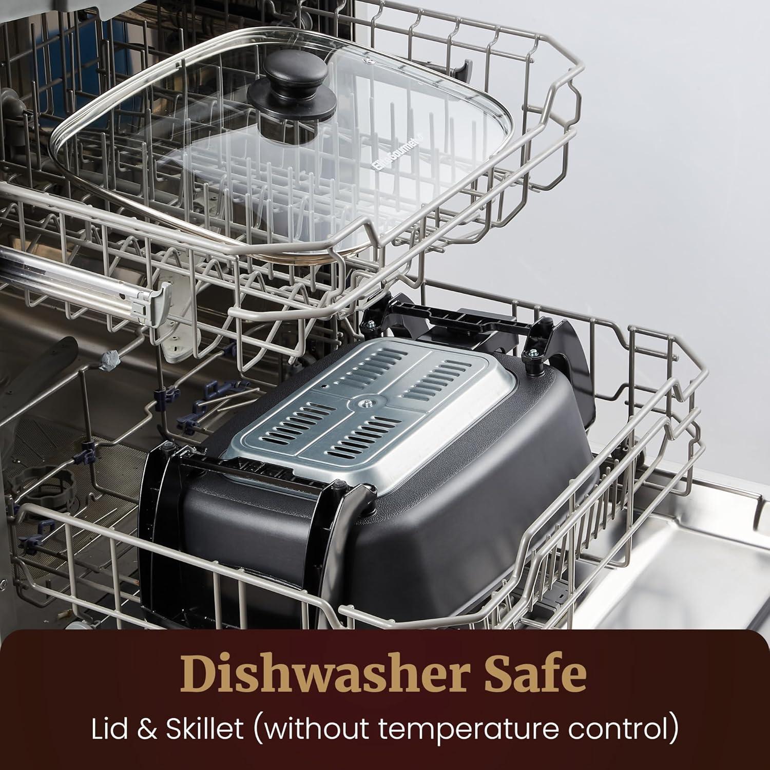 EASY TO CLEAN: After use, simply remove the temperature probe and place the skillet (top rack only) and lid in the dishwasher. The heavy-duty cast aluminum body resists warping and corrosion, ensuring long-lasting performance.